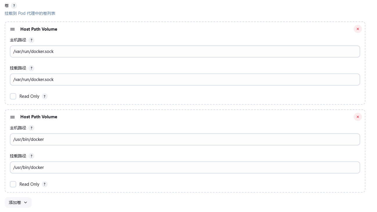 进入Dashboard -> Manage Jenkins -> Clouds -> kubernetes,Pod templates选择使用的模板,然后添加卷,配置如图